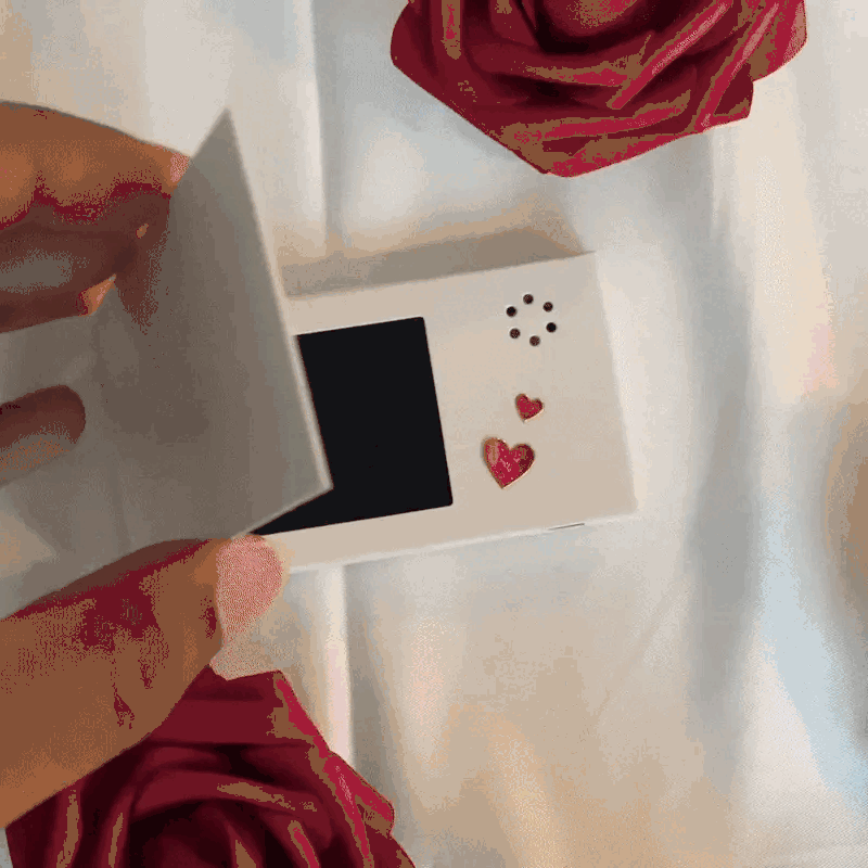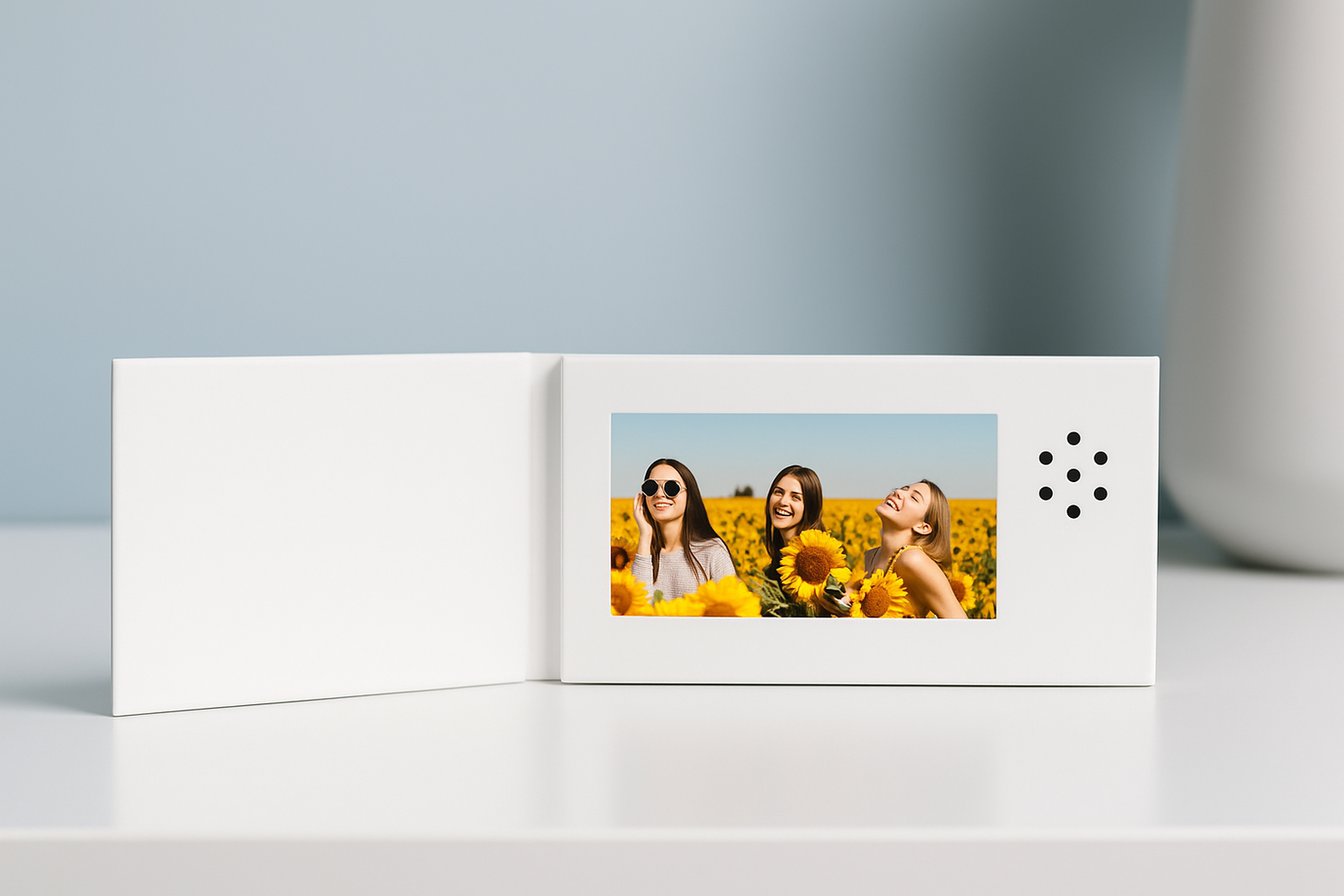 Una tarjeta con pantalla de video para decir, mostrar y emocionar.